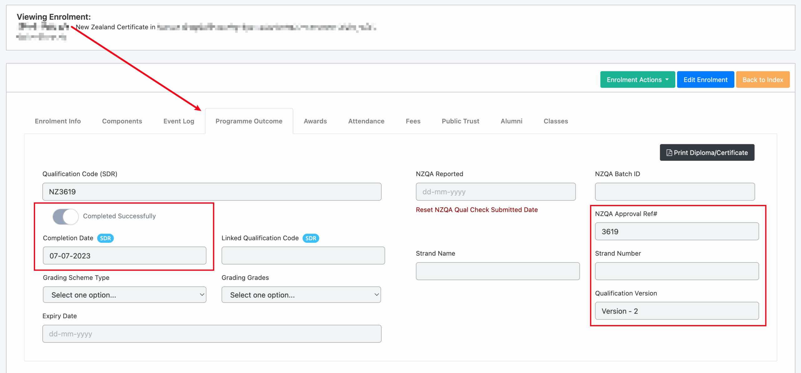 Enrolment: When the enrolment status is changed to “Finished and Completed”, the completion date is populated on the enrolment Programme Outcome tab. The NZQA qualification details are inherited from the programme settings.