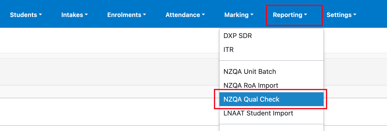 To generate a QE1 Batch, navigate to Reporting -> NZQA Qual Check